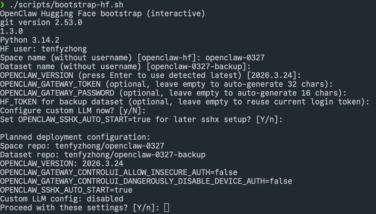 space_name(默认openclaw-hf)dataset_name(默认<space_name>-backup)OPENCLAW_VERSION(默认自动探测最新版本)OPENCLAW_GATEWAY_TOKEN(可留空自动生成)OPENCLAW_GATEWAY_PASSWORD(可留空自动生成)HF_TOKEN(可留空,复用本地已登录 token)- 是否立即配置 LLM(三项全填才生效)